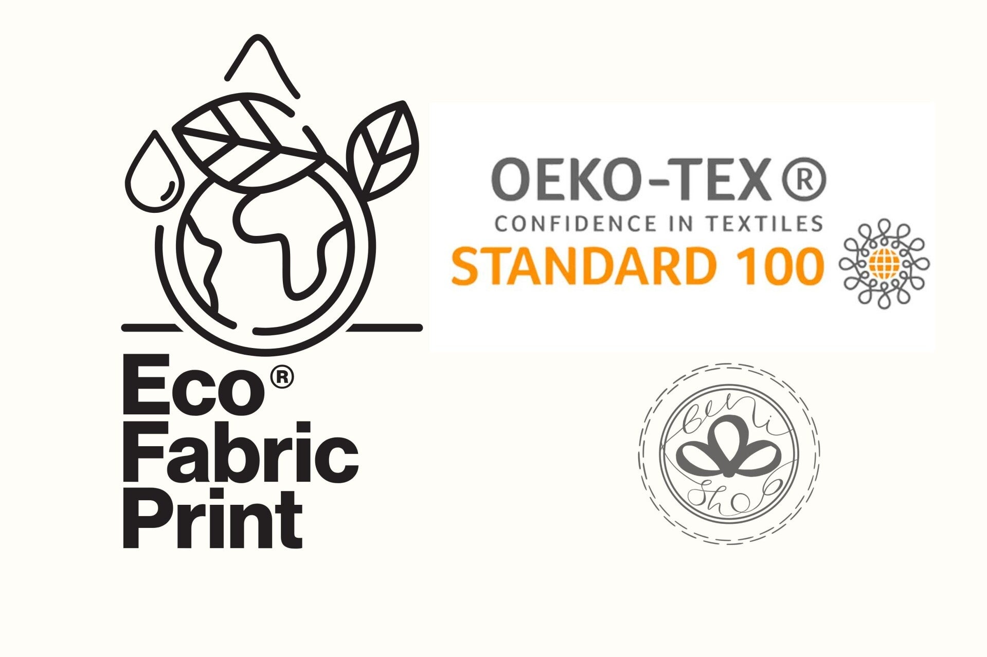 Zertifikate: Auf Anfrage stellen wir Nachweise zu unseren OEKO-TEX® Standard 100 und Eco Fabric Print®-Zertifikaten bereit.