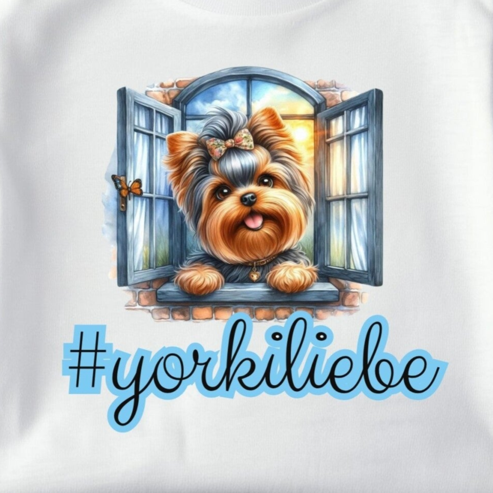 Bügelbild Hunde Süßer Yorkshire Terrier im Fenster Blau mit Schriftzug #yorkiliebe ca. 14x15 cm