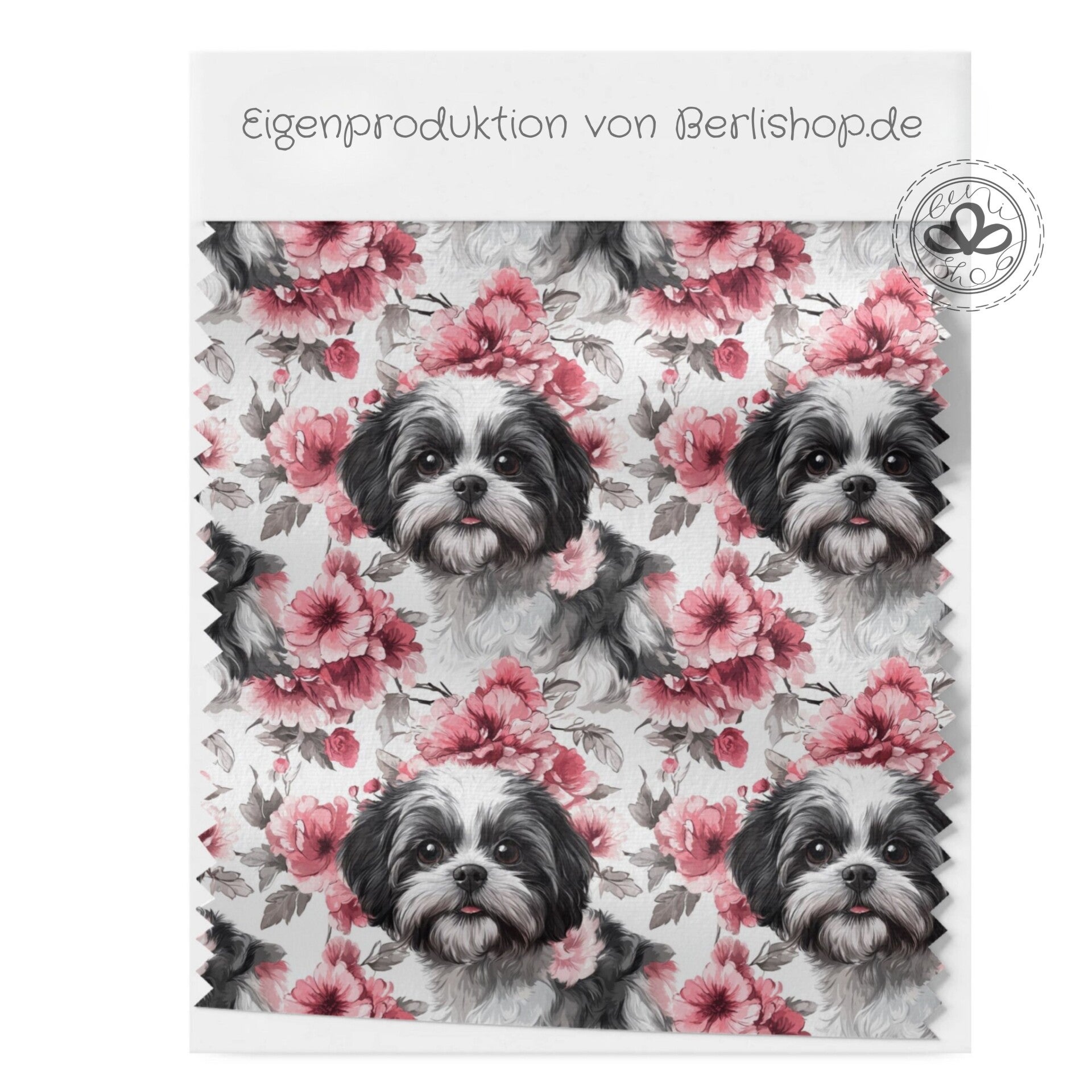 Vorbestellung Shih-Tzu Hunde Rote Blumen Stoffarten: French Terry, Baumwolle, Oxford, Jersey, Softshell, Musselin, Panamastoff